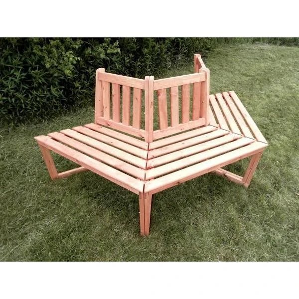 Mooie houten half-cirkelvormige tuinbank (180°) voor rond een boom. Deze massief grenenhouten tuinbank vormt een aangename zitplaats onder een boom in een oase van rust en schaduw. Het hout is geïmpregneerd en beschermd tegen weer en wind. Het heeft een honingbruine kleur.