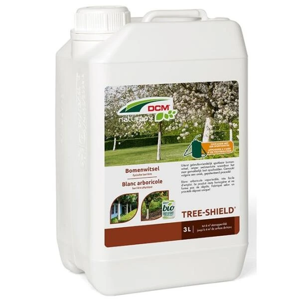 Het DCM bomenwitsel ‘Tree-Shield’ maakt een fysische barrière op bomen om ze te beschermen. Deze gebruiksklare, vernevelbare witkalk heeft een preventieve werking om fruit- en sierbomen in de winter te beschermen tegen vorstscheuren en in de zomer tegen zonnebrand. Een witte stam weerkaatst immers het felle zonlicht en zorgt ervoor dat grote temperatuurschommelingen op de stam worden vermeden. Zo wordt ook vermeden dat er in het voorjaar na enkele mooie dagen al volop sapstroom op gang wordt gebracht waardoor nieuwe uitlopers na een eerstvolgende winterprik terug stuk zouden vriezen.