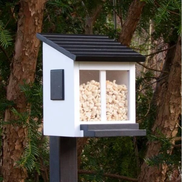 Eekhoorns zijn intelligente dieren en leren snel hoe zij bij allerhande lekkernijen kunnen komen, hoe moeilijk dat soms ook lijkt te zijn. Het dak sluit weer op het moment dat de eekhoorn klaar is met eten zodat andere dieren en vogels niet bij het voer kunnen. Het eekhoornvoederhuisje is gemaakt van massief weerbestendig hout en is voorzien van een ophangblok voor montage tegen een muur of boom.