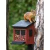 De eekhoorn ziet het voedsel achter het doorzichtige plexi plaatje en opent het voederhuisje zelf via het deksel om bij het voedsel te geraken. Daarna sluit het deksel terug dicht zodat het voedsel droog blijft.