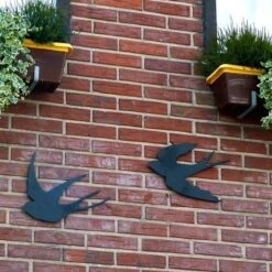Set van twee sierlijke gietijzeren zwaluwen als muurdecoratie, geschikt om zowel binnen als buiten op te hangen.