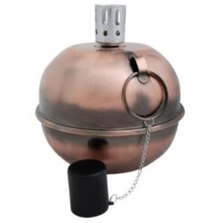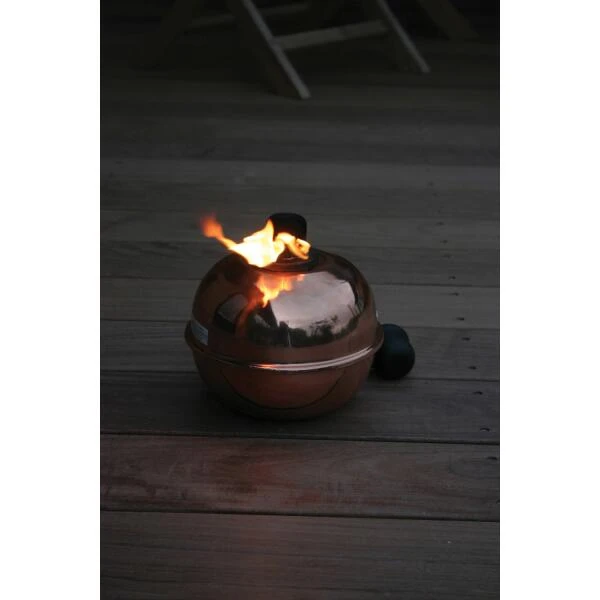 Deze verkoperde metalen tuimeltoorts is aan de onderzijde verzwaard met grind zodat de fakkel als hij uit balans wordt gebracht zichzelf weer opricht. De tuimeltoorts is voorzien van een zeer dik lont die zelfs bij zware wind niet uitwaait. De olielamp kan heel eenvoudig van bovenaf in de lamp worden gegoten. De fakkel brandt met normale brandolie en voor 2/3 gevuld ongeveer 24 uur voordat er opnieuw bijgevuld moet worden.
