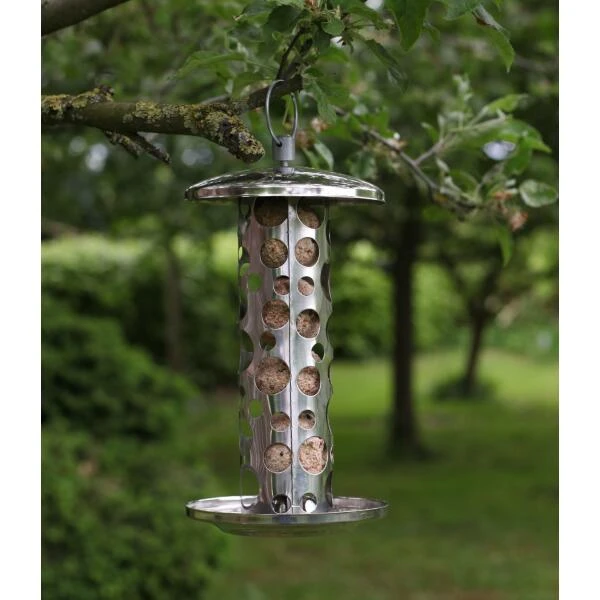 Mooie, moderne vetbollenautomaat in roestvast staal. Deze voederautomaat biedt plaats aan 4 tot 5 vetbollen en is geschikt voor het gebruik van vetbollen zonder netje. Een vetbollenautomaat heeft als voordeel dat grote vogels zoals kauwen en eksters er niet met volledige mezenbollen vandoor gaan.