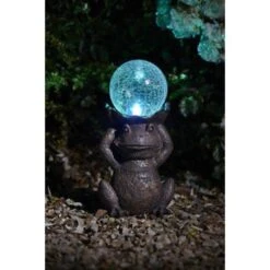 Deze lachende kikker ondersteunt een mooie lichtbol op zonne-energie. Deze tuindecoratie geeft overdag en ’s avonds een charmante sfeer aan jouw terras, patio, voordeur of plantenborder. De kikker is leuk gezelschap voor groot en klein en in het duister straalt de lichtbol een feeëriek licht uit. Geen elektrische voeding of bekabeling nodig want het zonlicht wordt door het zonnepaneel opgevangen en opgeslagen in interne batterijen. Dankzij de ingebouwde lichtsensor gaat de verlichting automatisch branden zodra het donker wordt.