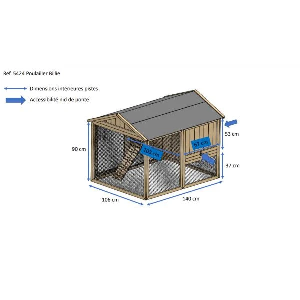 Geef jouw kippen een veilige en ruime thuis met dit mooie kippenhok. Het hok bestaat uit een verhoogd nest met zitstok, toegankelijk via het loopplankje, en een ruime buitenren waar ze vrolijk kunnen rondscharrelen. Het geheel is overdekt met een waterdicht dak in bitumen. Met dit hok zijn jouw kippen beschermd tegen roofdieren, terwijl ze toch nog voldoende ruimte hebben.