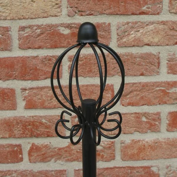 De metalen paal monteer je vlot, stevige grondpin onderaan en sierlijk topstuk bonenaan. Aan deze top bevestig je de 8 meegeleverde draden en spant ze op, bevestig ze onderaan met een grondpin in de bodem en zo ontstaat de piramidevorm. Zaai of plant nu jouw planten aan de voet van elke draad en de planten klimmen hun weg omhoog langs de draden. Het resultaat is een sierlijke klimsteun voor de groenten- en/ of siertuin met jouw favoriete klimplanten.