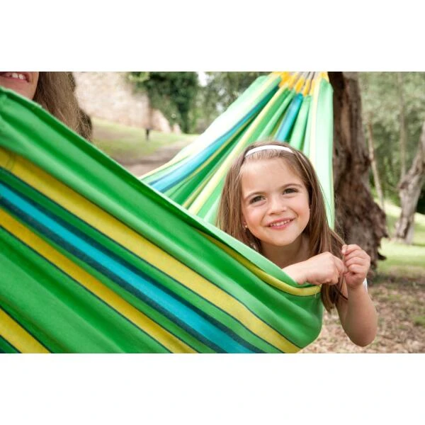 De Currambera hangmat van La Siesta is een klassieke tweepersoonshangmat uit hoogwaardig katoen. De stof heeft stralende kleuren en is extra zacht. Het biedt een knusse plek om in de tuin of op reis heerlijk met zijn tweeën te vertoeven. Het fleurige feelgoodstatement voor groot en klein!