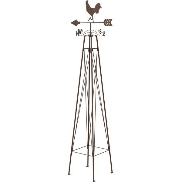 Mooie roest gepoedercoate klimhulp met windhaan voor tuinplanten. Deze obelisk geeft steun aan klimplanten in een border, perk of bloembak.