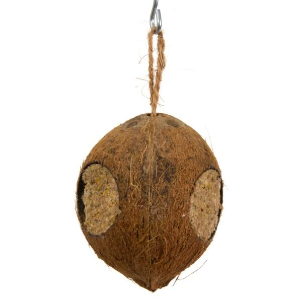 Een gevulde kokosnoot voorzien van meerdere openingen waaruit vogels het vet met zaden kunnen oppikken. Met de voorziene lus kan je de kokosnoot makkelijk ophangen.