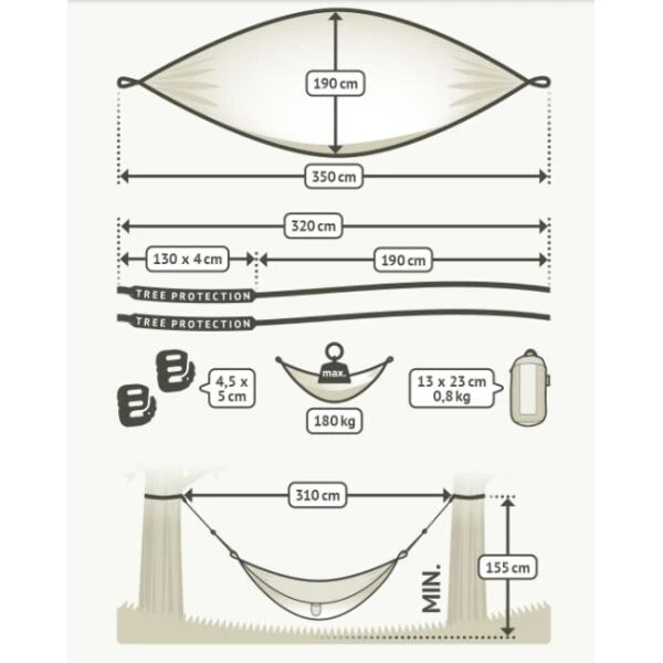 Met de extra brede boomriem kan je de hangmat stevig rond een boomstam bevestigen zonder de boomschors te beschadigen. De riem geeft hierbij een optimale steun. Met de door La Siësta ontwikkelde CrocodileHooks hang je de mat veilig op en kan je ze in de hoogte verstellen.