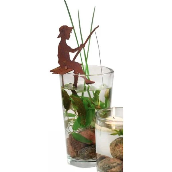 Een visser zittend op een steiger, een rustgevend beeld dat ideaal is als decoratie aan de vijver of bij een klein waterelement. In combinatie met een vaas, bloemenschaal of aquarium kan dit unieke beeld ook in het interieur voor de nodige sfeer zorgen.