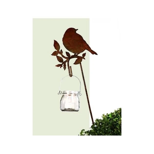 Dit unieke silhouet van een vogel rustend op een tak is voorzien van een stevige pin met een haak. Deze haak kan gebruikt worden om verschillende soorten voeder aan de vogels in de tuin aan te bieden of als ophanghaak voor een windlicht of lantaarn. Het geheel is met de hand vervaardigd uit speciaal gevormd en behandeld metaal met een roestige look.