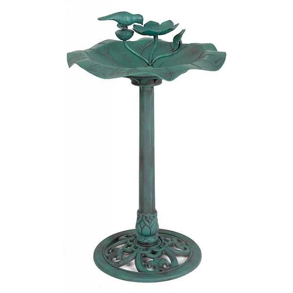 Een prachtige waterschaal in de vorm van een lotusblad met daarin een bloem en een drinkende vogel. Deze waterschaal is de ideale plaats voor tuinvogels die nood hebben aan water om te drinken of te baden.