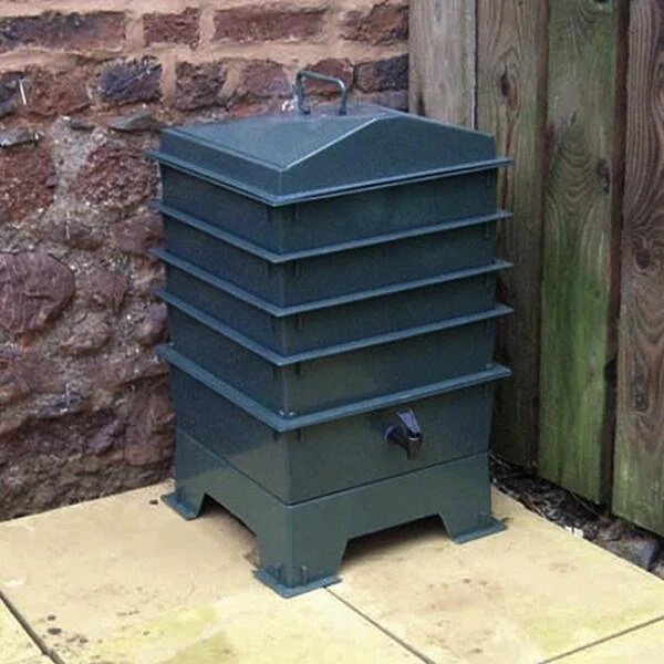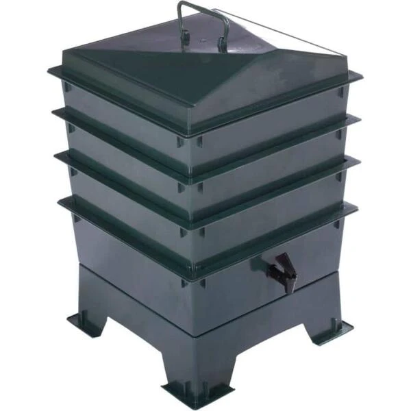 De wormenbak bestaat uit vier stapelbare geperforeerde afvalschalen. Het afval wordt samen met de wormen in de bovenste schaal onder het deksel geplaatst. De wormen zullen het afval in een reukloos enzymatisch proces omzetten tot een voedzaam substraat en compostthee of wormenextract. De vier afvalschalen zorgen ervoor dat je ze onderling kan gaan verwisselen naargelang het materiaal is gecomposteerd zodat er telkens een lege schaal bovenop komt te staan. De wormen migreren vervolgens doorheen de geperforeerde bodem.