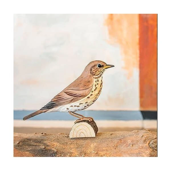 Ambachtelijk vormgegeven houten zanglijster. De lijster wordt op ware grootte weergegeven en is beschilderd met milieuvriendelijke verf.